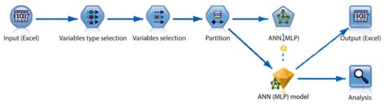 The MLP ANN was implemented in the IBM SPSS Modeler 18 software tool. Figure 5 displays the developed data stream. Initially, the input data was imported to the data stream (using Excel node). The filter and type were utilized to select relevant input data, assign correct variable types (continuous, categorical, etc.), and predefining inputs and the outputs. The data stream continues with a partitioning node with a predefined ratio of 40% training, 30% testing, and 30% validation. Commonly, K-fold, V-fold, N-fold, and partitioning methods are used to evaluate the performance of the developed models in the IBM SPSS modeler. K-fold, V-fold, and N-fold are splitting methods that divide the dataset into as many parts as there are possible values for a split field. Splitting results in every input vector are used for training and validation (by building multiple models). Unlike splitting, partitioning is used to evaluate the performance of a single model. It randomly divides the input dataset into three parts of training, testing, and validation. It provides a good indication of model performance by using one sample to generate the model and a separate sample to test and evaluate it. In general, partitioning is an optimal validation method for building a single model with the large datasets. Using validation partition, the built models can perform predictions using only predictors. In the next stage, the partitioned data are fed into the ANN modeling node, and the IBM SPSS modeler algorithm guide [] mathematically describes its MLP model as followings: