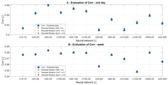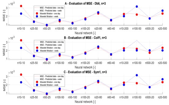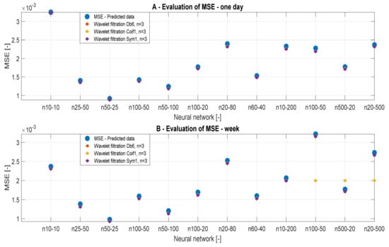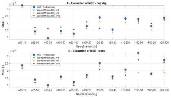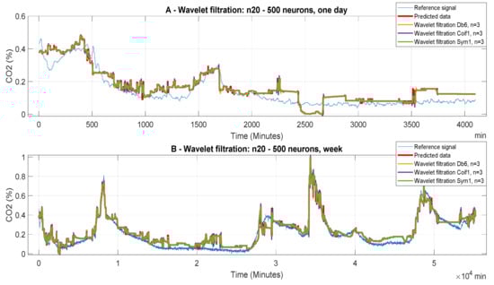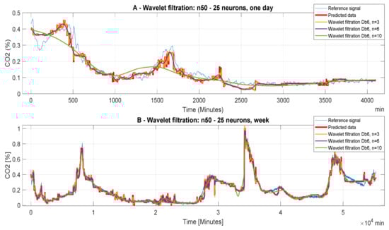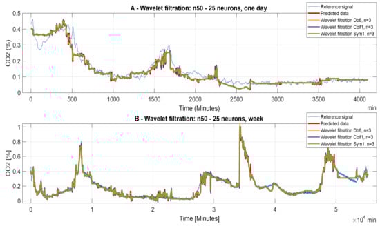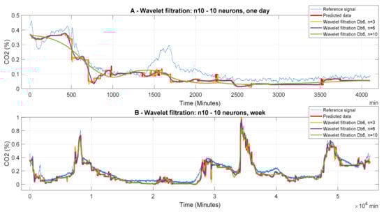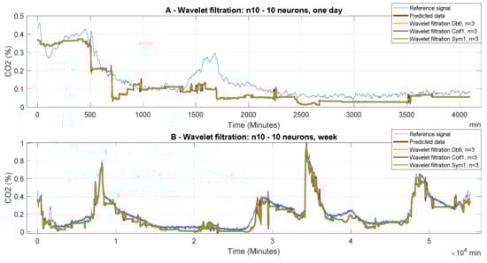 Figure 6 represents the filtered signals which were processed by the ANN, containing 10 neurons in the first hidden layer and 10 neurons in the second layer; it compares the predicted and the reference signals. In the first case (Figure 6A), it is one-day data. It is apparent that n = 10 is not suitable for the wavelet settings due to significant distortion of the filtered signal as comparing with the reference signal. Thus, there is high suppression of the CO2 information. The graph shows that the signal predicted by the ANN and the consequent filtered signals in all cases of wavelet filtration show a considerable deviation as compared with the reference signal. In the second case (Figure 6B), we report a week prediction. In this case, we observe, for all variants of wavelet filtration, a relatively accurate prediction of the CO2 concentration as compared with the reference signal, taking into account the purpose of the predictions. A more accurate assessment of the quality of prediction and subsequent filtration is performed using MSE analysis and correlation analysis.
