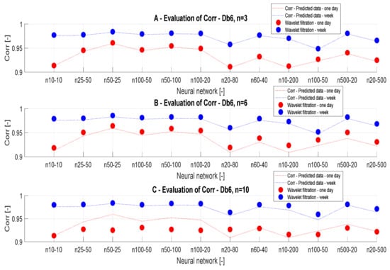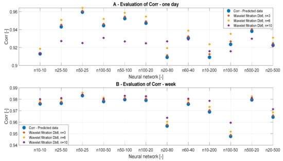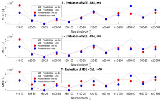 Figure 7 represents filtered signals, predicted with the ANN with 20 neurons in the first hidden layer and 500 neurons in the second layer (model 12). In this particular case, we can observe a more accurate prediction against the reference signal. In the first case (Figure 7A), which belongs to analyzed daily signals, it is possible to observe the generated parasitic data for all possibilities of wavelet filtration. Again, the predicted data and the wavelet filtration data are inaccurate with respect to the reference signal. Their next evaluation will be given by objective evaluation. We can also note large distortions and loss of important information when n = 10. In the second case (Figure 7B), which is related to the predicted weekly data, we receive the most accurate prediction regarding the reference. By comparing the prediction signal in Figure 9 and Figure 10, it becomes apparent that the settings of the ANN have a significant impact on the prediction accuracy