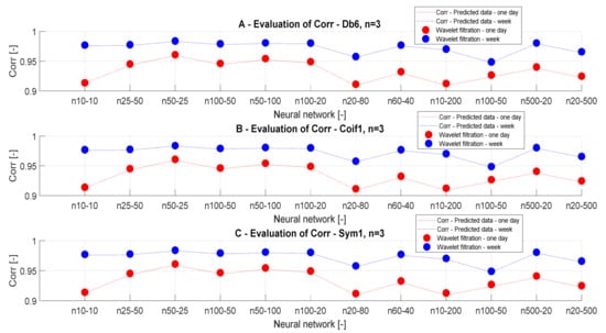 In this section, we present testing and optimization of the wavelet settings from the view of wavelet filtration settings and levels of the decomposition, as well as for the different time ranges of the native CO2 signals and selection of the ANN. In our analysis, we bring a comparative analysis of the testing trend-level (n) of the wavelet-based CO2 concentration predicted waveform decomposition where n = 3, 6, and 10. Each such level performs the signal decomposition into approximation and detail coefficients according to the Mallat decomposition scheme. In each decomposition level, a part of the CO2 signal energy is stored in approximation coefficients, representing the CO2 signal trend and the rest of the energy is kept in the detail coefficients. In this way, part of the signal energy is suppressed in the detail coefficients. Regarding the decomposition level, we use the fact that the higher the decomposition level, the more energy is removed from the CO2 trend and the resulting signal morphology is more distorted. We experimentally set the minimal energy which should be stored in the signal trend as 75% (n = 10), minimal CO2 signal change 5% (n = 6) from the original CO2 signal, and their average (n = 6). These decomposition settings are used for the comparative analysis of the best wavelet settings for improvement of the CO2 prediction accuracy.