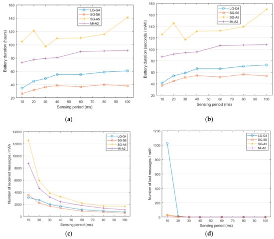 - Number of lost messages per consumed energy unit (lost messages/mAh), computed as the ratio between the total number of notification messages lost in the transmission from the sensors to the smartphone and the battery capacity. This parameter characterizes the losses experienced by the system during the tests.