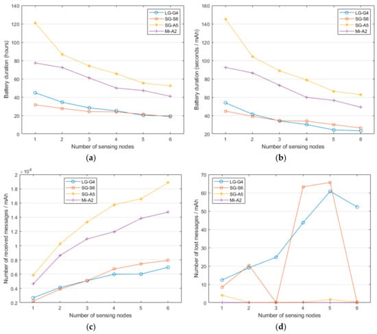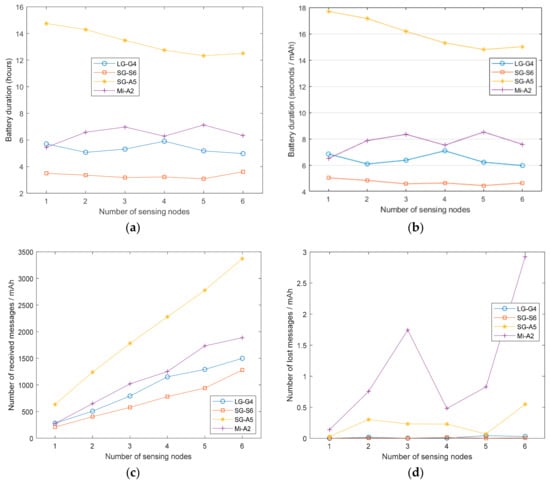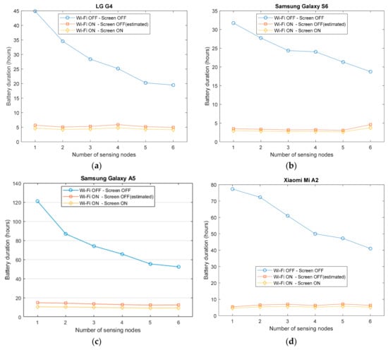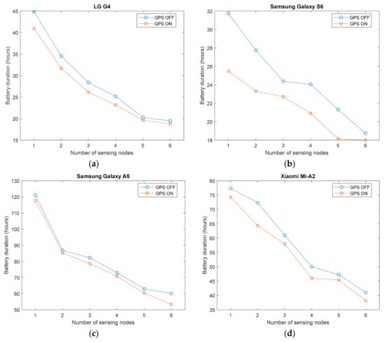 We have executed a battery durability test for all the designed configurations of the testbed. The general testing method was to fully charge the smartphone battery and configure the app to connect to a predetermined number of sensing nodes with some predefined parameters. Once the corresponding Bluetooth connections are established, the app starts receiving the inertial data from the SensorTags and the transmission continues until the smartphone battery is depleted. Since the goal was to quantify the energy drain in the phone, the SensorTags were USB-powered instead of being battery operated (with CR2032 coin cell batteries). This prevents malfunctions or interruptions in the wireless transmissions caused by energy shortage problems of the external nodes.