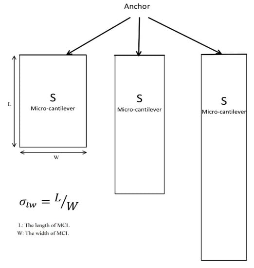 Different shapes affect the detection performance of micro-cantilever. For rectangular shell structure, the is mainly considered. Different length to width ratios () were set to investigate the effects of different shapes as shown in Figure 2. To eliminate the influence of the effective mass of the MCL, the thickness of the MCLs are set to 5 μm and the effective area (tunable surface area, S) is 4.5 × 104 μm2.