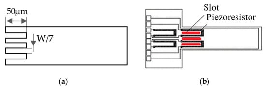 High rate of resistance change is beneficial to improve the signal intensity of the detection system, especially in MEMS sensors. In dynamic mode, the strain is positively correlated with the deflection of MCL in piezoresistive attachment area (0 μm < L < 50 μm). In addition, the deflection is also positively correlated with other signal readout methods. Hence, the read-out signal strength increases with the deflection. As shown in Figure 3a, three slots are arranged at the anchor end of the MCL. The length of the slots is 50 μm, the width of the slots is W/7 for each shape. The deflection, mass sensitivity, power dissipation, and Q-factor of the MCL will be investigated.