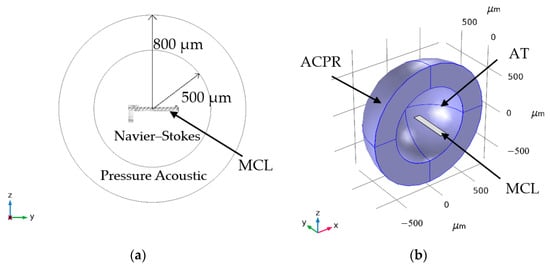 Thermal and viscous damping of the MCL also needs to be considered. It is necessary to include thermal conduction effects and viscous losses explicitly in the governing equation. The governing equations for the fluctuation (wave equation or Helmholtz equation) are derived by perturbing or linearizing the Navier–Stokes equations, momentum equation, continuity equation and energy equation []. This is achieved by solving the thermoviscous acoustics equations in the Thermoviscous Acoustics interfaces in the COMSOL Acoustics Module.