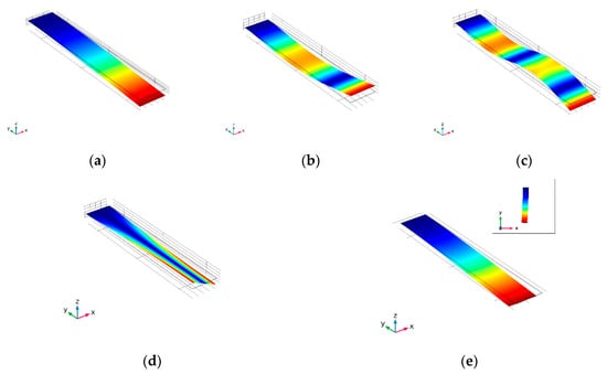 3D Visualization of simulated deflection with the maximum value. (a) 3D Visualization of simulated deflection in 1st z-Bending mode; (b) 3D Visualization of simulated deflection in 2nd z-Bending mode; (c) 3D Visualization of simulated deflection in 3rd z-Bending mode; (d) 3D Visualization of simulated deflection in Torsional mode; (e) 3D Visualization of simulated deflection in x-Bending mode.