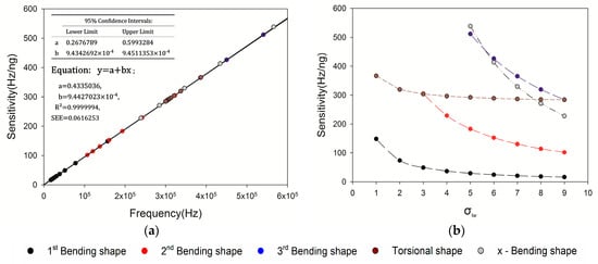 Figure 7a shows the linear fit of mass sensitivity and working frequency of MCLs. Compared to the continuous line, it is evident that the linear relationship between resonant frequency and mass sensitivity. In other words, the influence of of MCLs on the linear relationship between frequency and mass sensitivity is almost negligible. However, it is safe to say that different shapes have their resonant frequencies, which determine the sensitivity. The mass sensitivity is inversely proportional to the of MCLs in each vibration mode as shown in Figure 7b.