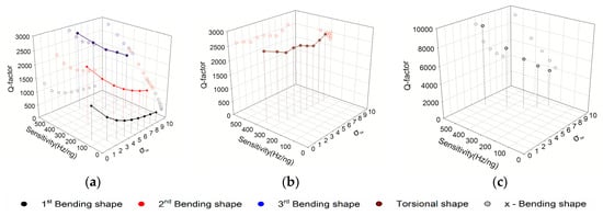Q-factor variation of MCLs structural. (a) Q-factors of MCLs in z-Bending vibration mode, (b) Q-factors of MCLs in torsional vibration mode, (c) Q-factors of MCLs in x-Bending vibration mode.