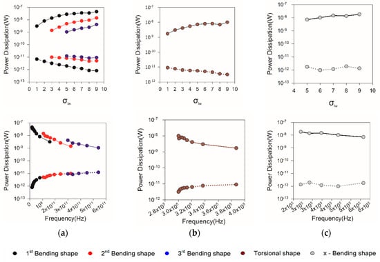 The power dissipation of conventional MCLs. (a) The power dissipation of MCLs in z-Bending vibration mode, (b) The power dissipation of MCLs in torsional vibration mode, (c) The power dissipation of MCLs in x-Bending vibration mode.