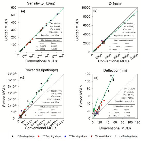 Variation in slotted and conventional MCLs. (a) The sensitivity change of structure between slotted and conventional MCLs, (b) The Q-factor change between slotted and conventional MCLs, (c) The power dissipation between slotted and conventional MCLs, (d) The maximum deflection at the piezoresistive resistance area (along MCL length, 50 μm), the green arrow refers to the point ( 1, torsional mode) where the deflection increases is the largest one.