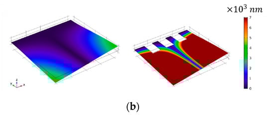 The 1:1 line graph of variation in slotted and conventional MCLs is shown in Figure 10. Compared with the 1:1 line, which is represented as one continuous line. The green dotted line is a linear fit curve. We can see that only the fitting curve of sensitivity is close to the line of 1:1, and others have different degrees of offset. Among them, deflection has the largest deviation. This shows that the deflection of micro cantilevers increases significantly. Besides, there is a significant increase in the power dissipation of the slotted MCLs relative to the conventional MCLs is shown in Figure 10c. This may be due to the fact that the slotted structure increases the deflection of the MCLs. As expected, the maximum deflection at the piezoresistive resistance area with length =50 μm of the slotted MCLs are larger, which is clearly shown in Figure 10d. It is worth noting that the growth rate corresponding to the green arrow in the figure is the largest one. This point corresponds to a torsional mode with 1. The line graph of variation in deflection of slotted and conventional MCLs with distance to anchor end is shown in Figure 11a. Figure 11b shows 3D visualization of slotted and conventional MCLs deflection in torsional mode. In the torsional mode with 1, the wider width and the longer anchor end result in an enormous deflection change.