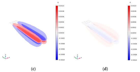 The temperature variation of slotted MCL in 1st Bending mode and Torsional mode are shown in Figure 12a,c, respectively. The position of maximum temperature variation is opposite to that of minimum temperature variation. As we know, temperature variation is closely related to pressure variation through equation of state. The temperature gradient near the surface of the MCL under isothermal conditions leads to thermal dissipation. As an obvious contrast, it can be seen that the MCL with edge serrations has a smaller temperature variation as shown in Figure 12b,d. The max temperature variation in slotted MCL and slotted MCL with edge serrations are summarized in Table 4. Lower thermal dissipation is observed in slotted MCL with edge serrations.