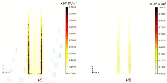 Top view of viscous dissipation density (W/m3). (a) Viscous dissipation density around the slotted MCL in 1st Bending mode, (b) Viscous dissipation density around the slotted MCL with edge serrations in 1st Bending mode, (c) Viscous dissipation density around the slotted MCL in torsional mode, (d) Viscous dissipation density around the slotted MCL with edge serrations in torsional mode.