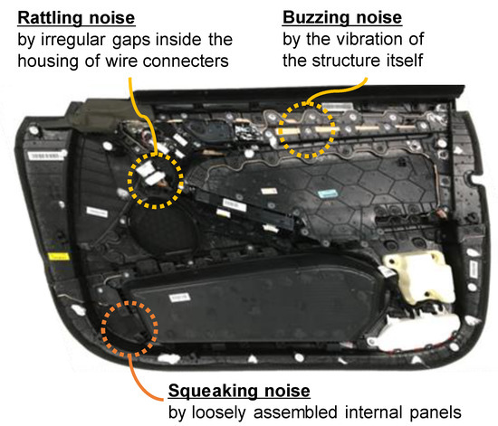 The powertrain, drivetrain, tire contact with the road surface, and climate-control system are considered to be major sources of annoying noise audible in the interior of a car. This noise can adversely affect the driver’s ability to concentrate [1]. Recent advances in noise control technology regarding these systems have successfully reduced the overall level of persistent interior noise [2,3]. However, the decreased noise level paradoxically draws the driver’s attention to weakly audible and occasional interior types of noise known as buzzing, squeaking, and rattling (BSR) noise. Recent research determined the BSR noise in vehicles to be an important cause of customer dissatisfaction [4,5]. Especially, in the case of the car door trim panel, Hyundai Motor and Kia Motors reported that 47% of the recalled car door trim panels in 2013 were claimed to be responsible for BSR noise generated while driving