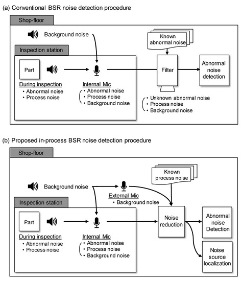 The conventional approach of noise detection using microphones is represented as in Figure 2a. In this case, detection is usually conducted using the signals collected by microphones installed inside the inspection workstation. The direct analysis of acoustic signals is difficult because these signals are easily contaminated by background noise. This necessitates the use of a noise reduction procedure, which utilizes subtractive noise reduction after estimation of the background noise [19]. However, because the microphones installed inside the workstation record all types of noise, it is impossible to estimate the exact background noise by using the signal-processing methods. Traditional noise reduction methods utilized trained background noise instead of estimation with signal-processing methods. The possibility of these methods imperfectly reducing the background noise always exists, because the shop-floor environment is characterized by many types of unexpected background noise that cannot be trained.