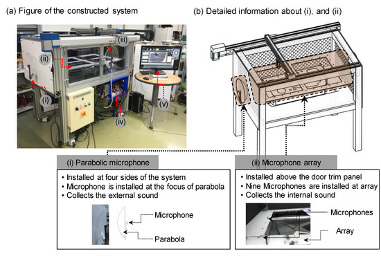 Configuration of the in-process BSR noise detection system: (a) image of the constructed system consisting of (i) four parabolic microphones, (ii) a sensor array of nine microphones, (iii) a pneumatic pusher controlled by a gantry robot, (iv) a data acquisition system, and (v) noise detection software; (b) illustration showing details about the (i) parabolic microphones and (ii) microphone array. The system detects abnormal noise generated in the defective door trim panel during the inspection process by using the acoustic data captured by the two groups of microphones.