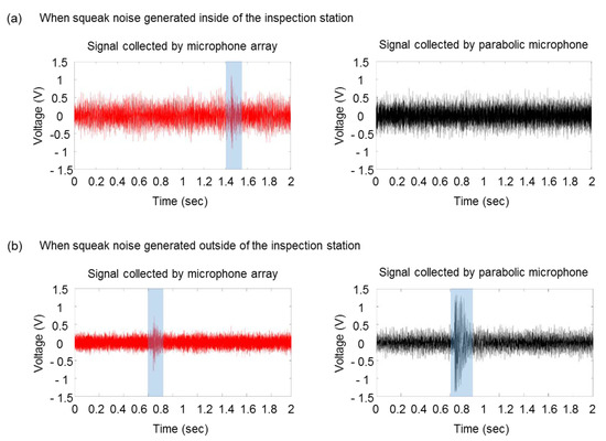 Figure 4 shows the different responses of a microphone of the microphone array and a parabolic microphone when squeaking noise is generated inside and outside the inspection station. When the noise is generated inside of the inspection station, the signal collected by the microphone array is only that generated by squeaking noise. On the other hand, squeaking noise can be found near 0.8 s in both groups of microphones when the noise is generated outside the inspection station. Then the parabolic microphones can be assumed to mainly collect background noise, whereas the microphone array is assumed to collect all three types of noise in situations in which the background noise is attenuated.
