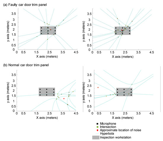Then, eight hyperbolas are obtained by considering the locations of each microphone as loci. The dominant signal is assumed to lie on one of the two branches of each hyperbola [35]. The intersections between the hyperbolas are assumed to be the possible location of the dominant noise. By computing the middle points of the intersections between all the hyperbolas, we finally estimate the location of the dominant signal. If the location is estimated to be inside the rectangle formed by the microphone array, the car door trim panel is determined to be faulty. Otherwise, the car door trim panel is determined to be healthy. Figure 6 shows examples of noise source localization using signals captured during the inspection of car door trim panels that are both faulty and healthy. When an analysis of the remaining signals of faulty car door trim shows that the estimated locations are inside the inspection workstation, then the car door trim panel is determined to be faulty. Alternatively, when an analysis of the remaining signals of faulty car door trim shows that the estimated locations are outside the inspection workstation, the car door trim panels are determined to be healthy.