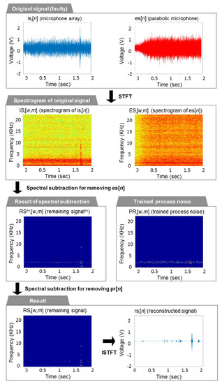 where is obtained by averaging all , where j = 1, 2, …, 4. The remaining signal RSesi[w,m] computed by using (4) is assumed to contain the abnormal noise and process noise. Subsequently, spectral subtraction is applied to RSesi[w,m] to remove the spectrum of the process noise, PRarrayi[w,m]. To do this, the attenuation factor for the spectral subtraction of is defined as follows: