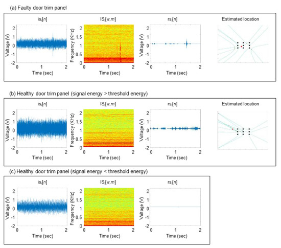 Figure 8 shows three noise detection cases selected from the inspection results. First, in the case of a faulty door trim panel as shown in Figure 8a, the energy of rsi[n] exceeds the predefined threshold, and further it is estimated that the noise is coming from inside the workstation. As a result, we can conclude that the panel is generating noise. Second, in cases of a healthy door trim panel as shown in Figure 8b, the energy of rsi[n] can exceed the predefined threshold due to irregular background noise. However, by noise source localization, we can estimate that the noise is coming only from outside the workstation, and consequently we can conclude that the panel is healthy. Last, if the energy of rsi[n] does not exceed the predefined threshold as shown in Figure 8c, we can conclude that the panel is healthy.