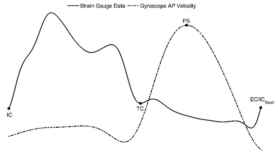 Lastly, the EC event corresponds to an instant at the end of the swing phase once the user stops swinging the cane and places the cane-tip in front of themselves. The time interval between IC and EC events here defines a full gait cycle. The EC event was identified as the positive strain gauge zero-crossing point that follows the PS event. Figure 3 shows an example of a gait cycle for multi-sensor cane data. All valid strides and corresponding temporal events (i.e., IC, TC, PS, and EC events) were identified in a similar fashion.