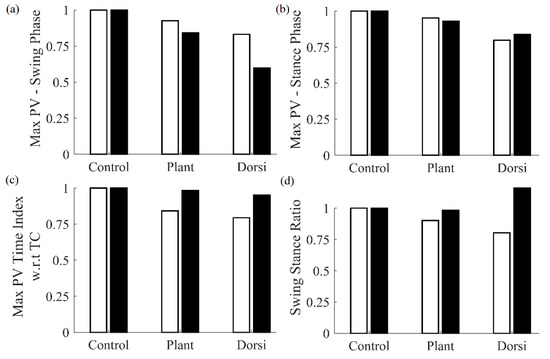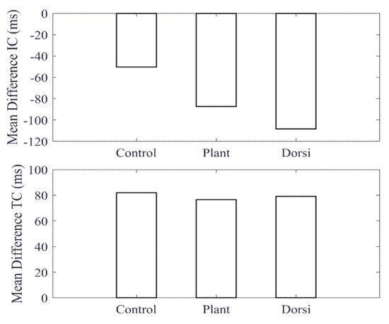 A comparison of features obtained from the cane and the shank-mounted IMU are shown in Figure 4. All features from the cane and shank-mounted IMU follow the same trend of decreasing in value with respect to the control condition. The exception was found to be the “swing stance ratio” feature (Figure 4d). By inspection, the cane data indicate that this was smaller for dorsiflexion with respect to the control case, whereas the shank-mounted IMU data indicate an increase. This can be explained due to the difference in the IC and TC events determined by the MSMF and GPD segmentation algorithms as shown in Figure 5. A negative difference in the IC suggests that the GPD algorithm determined IC events later in time, whereas a positive difference in TC means that GPD determined the TC event to occurs earlier.