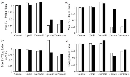 When walking on uphill or downhill terrains, pitch velocity during the swing and stance phases was higher with respect to the control case, and no significant difference was observed in the swing stance ratio. By contrast, while walking up and down stairs, pitch velocity during the swing and stance phases was lower with respect to the control and a significant decrease in swing stance ratio was observed.