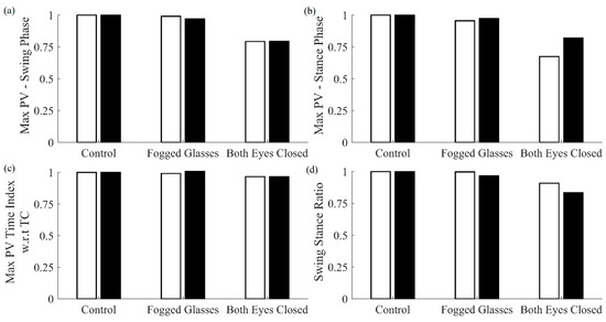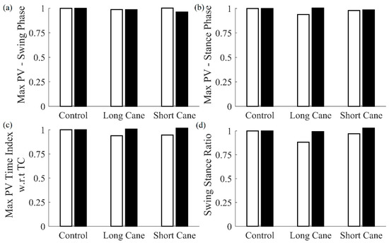 Comparison of features extracted using cane (white bar) and shank-mounted IMUs (black bar) for perturbed vision conditions. Each feature was normalized with respect to the control condition for cane and shank IMUs, respectively.