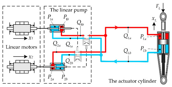 Li et al. initially proposed a conceptual design of a linear pump with collaborative rectification and discussed the pump composition principles. The internal two pump units were controlled to compress the fluid power and simultaneously rectify for each other. No extra valve control is needed. In addition to the structure simplicity, the advantage of this pump is the flowrate direction control flexibility [21]. Wang et al. used this pump to compose an EHA referred to as a linear-driven EHA (LEHA) and modeled the system by using an energetic macroscopic representation method [22]. This LEHA was kinematically simulated and the capability of its prototype was preliminarily tested [23].