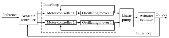 According to the above analysis, the control of the actuator can be divided into two loops as shown in Figure 8. The inner loop controls the linear motors to oscillate at the resonant frequency. The outer loop controls the actuator cylinder to follow the actuator position reference from the system input.