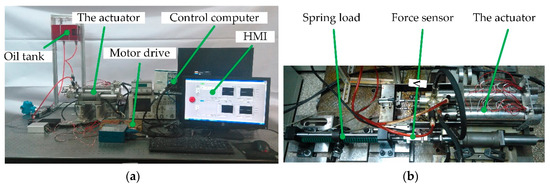 The actuator test rig: (a) the overall test rig with the actuator control system; (b) the actuator output force testing configuration.