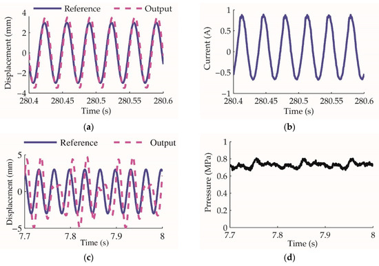 Linear motor oscillation closed-loop control experiment: (a) displacement reference and output without load; (b) current of the motor winding without load; (c) displacement reference and output with load; (d) the pressure acted on the motor mover is approximately 0.7 MPa, and for the effective area of the mover piston it is 48.1 mm2 according to Table 2, the equivalent force is 34 N.