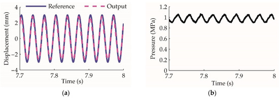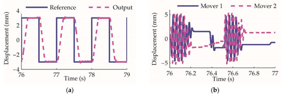 By employing the controller designed in Section 4.2, the actuator closed-loop control experiment results are shown in Figure 16. At the initial stage of the step response, the movers oscillate at the maximum range of ±5 mm and provide the maximum flowrate to drive the cylinder to track the reference as fast as possible. With the output approaching the reference, the amplitude decreases to 0, and the actuator cylinder is locked at the desired position.