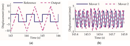 The actuator closed-loop control experiment: (a) the actuator cylinder position reference and output; (b) displacement of the two movers, the amplitude modulation and phase modulation is demonstrated.