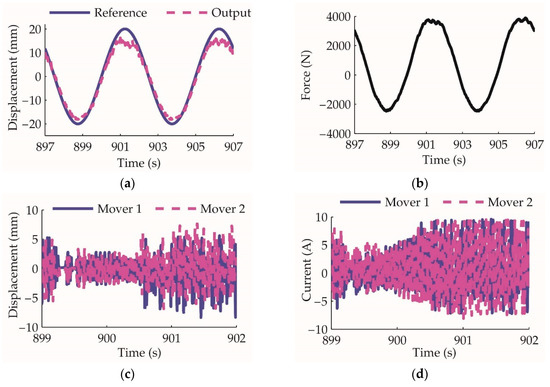 The actuator spring load experiment: (a) displacement reference and output of the actuator; (b) output force of the actuator; (c) displacement reference and output of the two movers; (d) the current of the two linear motors.