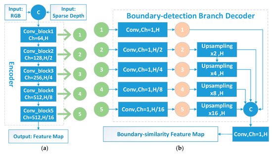 The boundary is valuable information to hint the discontinuity in the semantic labels and depth image. Therefore, a boundary detection decoder is designed to produce the required boundary similarity to the other two major tasks. As shown in Figure 2b, together with the output of the encoder part, different scales of skip-connection features are also fed into the boundary-detection branch. The boundary computed from the semantic ground truth image can be utilized as supervision signals to train the boundary detection branch. Different boundary feature maps from the th scale, marked as pink nodes in Figure 2b, are then introduced to the following semantic segmentation and depth completion branches.