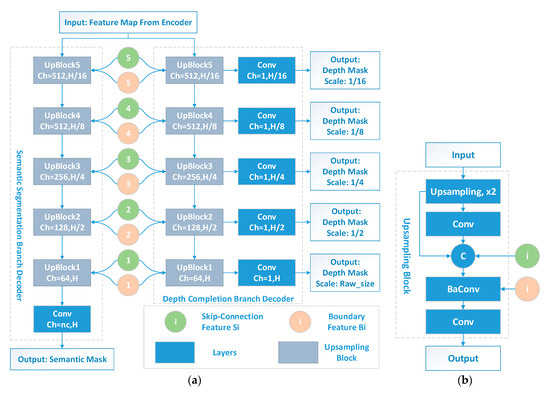 Semantic segmentation and depth completion decoder (a) and UpBlock structure (b). represents the number of semantic classes. BaConv refers to the boundary-aware convolution [20]. The bilinear interpolation upsampling layer is used in (b) as Upsampling, x2.