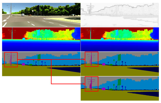 - CityScapes [37] is a real outdoor dataset, which contains high-quality semantic annotations of 5000 images collected in street scenes from 50 different cities. A total of 19 semantic labels are used for evaluation. They belong to 7 super categories: ground, construction, object, nature, sky, human, and vehicle. The ground truth of depth (disparity) is provided by the SGM method [37]. In the experiment, the original disparity images are randomly down-sampled to 5% density and used as sparse depth input. The training, validation, and testing sets contain 2975, 500 and 1525 images, respectively.
