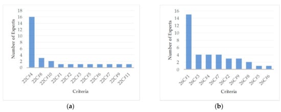 Average values were normalized and adjusted using weight coefficients, which took into consideration (1) the proportion of respondents (who selected that criterion) out of all respondents, and (2) the proportion of the sum of importance scores for the selected criterion with respect to the sum of all scores for all criteria. This procedure reduced the bias in the estimates. Then, the weighting rate of each criterion was calculated using Equation (1).