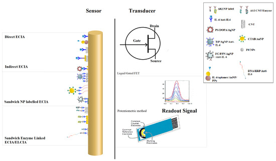 When the readout signal is generated by the direct interaction of detecting analyte with primary antibody which is immobilized on self-assembled monolayer (SAM) coated on electrode surface, we refer it as direct electrochemical immunoassay (dECIA). This is analogous to direct enzyme linked immunoassay (ELISA) approach which produces fluorescence when the antigen and antibody complexes are formed. Antibodies against IL-6 can be directly immobilized on the surface of a functionalized electrode [100] or nano-features can be introduced in the sensing layer [101,102,103] for signal amplification purposes as shown in Figure 2. A robust dECIA method with a wide linear range was demonstrated by Tertis et al. [101], and aptamer against IL-6 was immobilized on polypyrrole nanoparticles (PPy) decorated with gold nanoparticles (AuNPs) of 50 nm diameter. The wide dynamic range is due to the increased electrode surface area when modified with AuNPs. Another label-free approach of direct IL-6 detection was explained by Chen et al. [102] in 2016, and primary antibody against IL-6 was attached to carbon nanotubes. It was used as a liquid gate for field effect transistor (LGFET) with the source and drain made of gold. The formation of antibody–antigen complex changes the drain current which is used to quantify the concentration of IL-6 in the sample. An electrode modified with single-wall carbon nanotubes (SWCNT) and coated with AuNPs was used as impedance-based sensor, and it offers the greatest sensitivity and the lowest limit of detection (Table 2).