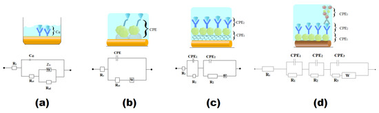 Electrode interface of different ECIA scheme with their equivalent circuits: (a) dECIA [100], (b) dECIA with nanolabel of Ppy/AuNP and aptamer specific to IL-6 for binding analyte [101], (c) dECIA with electrode coated with SWNT (single-walled carbon nanotubes)/AuNP [103], and (d) sELECIA with nanolabel of CNT/AuNP and enzyme label Horseradish Peroxidase [109].