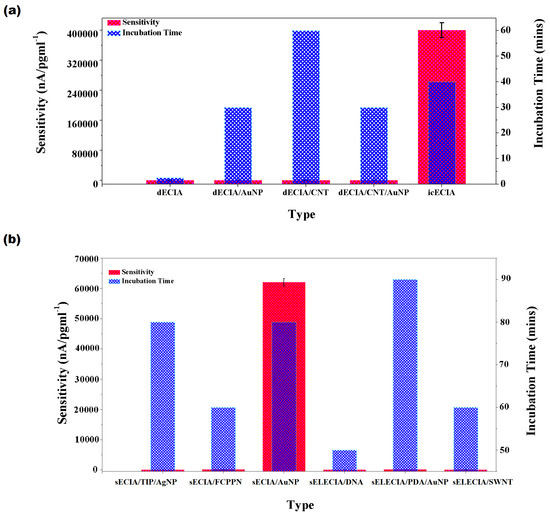Sensitivity of (a) direct electrochemical immunoassay/dECIA and indirect competitive electrochemical immunoassay/icECIA (calculated/obtained from [100,101,102,103,104]); (b) sandwich electrochemical immunossay/sECIA with nanomaterial or enzyme label/sELECIA (calculated/ obtained from [106,107,108,109,110,137]).