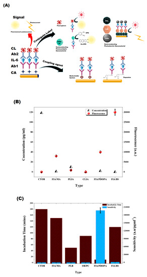 Toma and Tawa [140], in 2016, chose polydopamine (PDA) as the coupling agent for a surface plasmon-enhanced fluorescence spectroscopy (SPFS)-based sensor for IL-6 detection (Figure 6A). It has already been used as bifunctional linker in many biosensing platforms developed for diverse application and was found to enhance the SPFS signal [145,146,147,148]. The thickness of the PDA layer on glass substrate coated with gold was optimized to 1.5 nm to achieve the best SPFS response. The detecting/secondary antibody was labeled with Alex Fluor 647 and produced fluorescence following the reaction with IL-6-Anti IL-6 complex. The inevitable change in PDA-associated sensitivity and increase in dynamic range for the fluorescence immunoassay (FIA) diversifies its application in clinical diagnosis with minimum incubation time (Figure 6C and Table 3). In contrast, Zang et al. [139] developed a biotin–streptavidin system (BAS) in 2018 to couple biomolecules on the sensor’s surface (Figure 6A). The strong covalent interaction of the biotin–streptavidin complex [149,150] helps it sustain extreme chemical conditions [151] and makes it a favorable candidate for surface modification applications [152,153]. BAS involved attachment of sulfo-NHS-Biotin on a glass substrate, which was further modified with the streptavidin molecule with multiple active sites facing outward. Biotinylated-antibody for IL-6 was immobilized on the surface, and superparamagnetic oxide conjugated secondary antibody was used for fluorescence-based detection. Surprisingly, the highest signal-to-LOD ratio was obtained with the BAS coupling approach, but it generated a narrow linear response, which limits its prognostic capabilities required for clinical applications (Figure 6 and Table 3). Its sensitivity remains comparable to other FIA-based IL-6 detection methods (Figure 6B).
