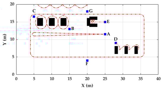 Map of the indoor environment used for collecting the FAU dataset. Blue squares represent chairs that denote start/end positions of activities. Black rectangles represent tables, and dotted red lines represent the possible trajectories followed by participants in each activity.