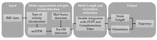 A trajectory reconstruction pipeline was carried out separately for each activity of both datasets (Figure 4). This pipeline is based on previous work by Hannink et al. [26]. A type of activity classification step was included. Toe-Off and Mid-Stance algorithms were modified in order to deal with non-walking strides as well as a complementary filter added for stride length and orientation estimation.