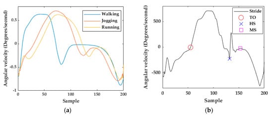 (a) Walking, jogging, and running templates (gyroscope z-axis). (b) Running stride example (gyroscope z-axis).