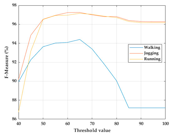 The precision and sensitivity of the stride segmentation using msDTW can be tuned using a threshold. The threshold needed to detect a stride indicates the similarity between that stride and the template used, that is, a large threshold indicates a large difference between the template and the segmented stride [23]. Therefore, with a very small threshold, the number of false negatives strides would increase, and a very large threshold would generate false positives strides. Thresholds from 0 to 100 in steps of 5 were tested on the training dataset. As a result, it was found that a fixed threshold of 65 maximizes the F-score of the stride segmentation in walking, jogging, and running activities (Figure 7).