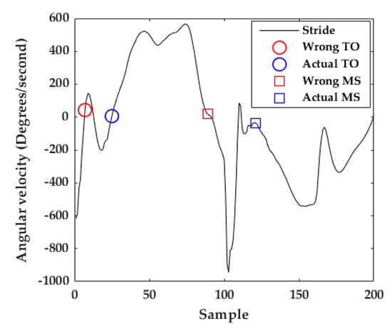 At TO, the gyroscope z-axis describes a zero-crossing because of the ankle joint changes from plantar flexion to a dorsal extension position in the sagittal plane [23]. The algorithm included in [31] for TO detection consists of detecting the first zero-crossing in the gyroscope z-axis. Due to the abrupt movements in jogging and running strides, in a few cases, a peak located at the beginning of the stride causes a zero crossing. This would lead to a wrong TO detection (red circle in Figure 8). Consequently, the adapted algorithm for TO detection (Algorithm 1) find the maximum peak of the signal and then find the nearest zero crossing before it (blue circle in Figure 8). After the detection of all the TOs that belong to the activity, all the portions corresponding from TO to TO are considered as strides (Figure 6b). Considering that the stride time of walking strides is around one second [24], if one TO to TO portion is greater than 2 s (400 samples), only the signal until 1.5 s was taken into account. This often happens because the participant is standing still or sitting.