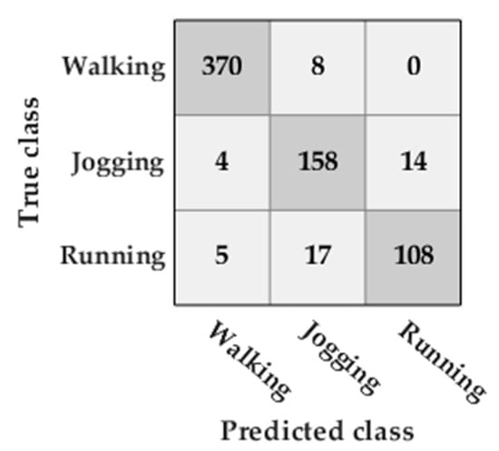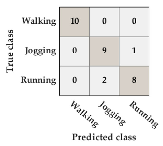 The accuracy in the activity classification was 90%. There were only three misclassifications: two running activities were classified as jogging activities and one jogging activity was classified as a running activity (Figure 9).