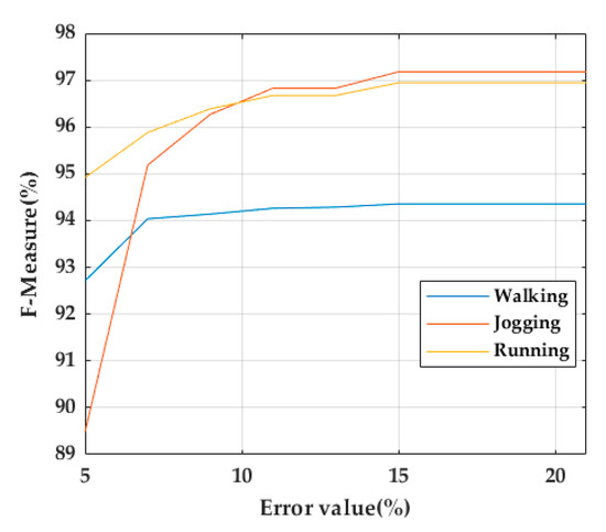 In this dataset, TO and MS were manually labeled. A TO/MS is considered as a true positive (TP) if it is located within 15% of the total number of samples of the stride to the right and left of the TO/MS ground truth. A false positive (FP) occurs when a TO/MS is detected outside this range. A false negative (FN) indicates that a TO/MS for a stride was not detected. Having in mind that 40% and 60% of the stride corresponds to the stance-phase of walking and running strides, respectively [25], the TO detection performance was evaluated in the training dataset using error ranges from 5% to 21% of the total stride in steps of 3% (Figure 10). As a result, 15% was chosen as an acceptable error range for TP calculation.